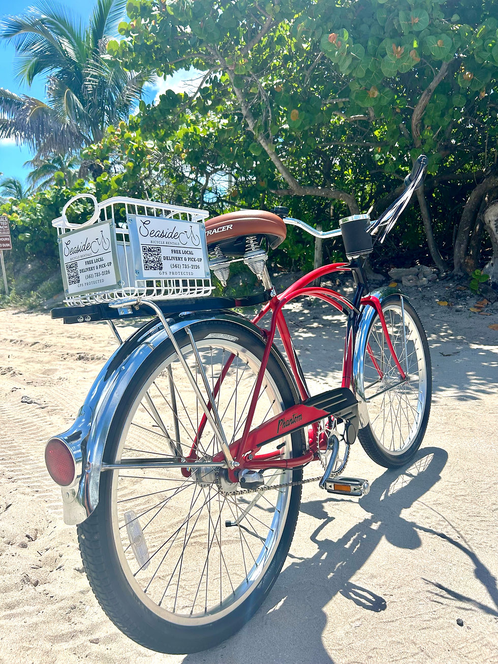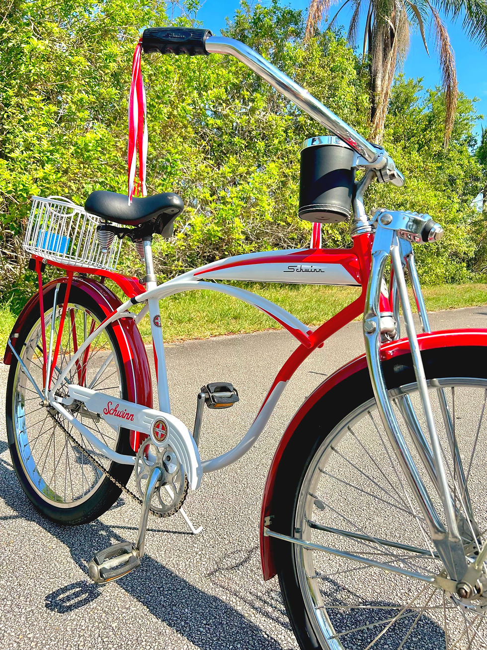 Schwinn Red Phantom The Vintage Schwinn Red Phantom blends timeless design with unmistakable retro style. Finished in a deep red and black colorway, this cruiser delivers the perfect mix of vintage character and modern comfort. Its springer front fork softens the ride, while the spring saddle and upright handlebars make for easy, relaxed cruising through Delray Beach. With a 3-speed drivetrain and coaster-brake setup, the Red Phantom offers just the right balance of simplicity and versatility—ideal for beach paths, side streets, or a slow sunset ride. Designed for riders between 5′2″ and 6′2″ tall. 26″ wheels provide a stable, balanced ride for all-day comfort. **Features** • Striking red and black Schwinn design with step-over frame • Springer front fork for smooth, classic ride quality • Spring saddle seat for added comfort • Durable 26″ blackwall tires for a bold, timeless look • 3-speed drivetrain for flexible cruising and gentle hills • Reliable coaster-brake for simple stopping • Rear rack and basket for light carrying convenience • Fits most adult riders (5′2″–6′2″) **Extras Included** • Compact Rear Basket – Ideal for light essentials or small beach bag • Cup holder for your favorite drink • Bell for friendly alerts • Lock for peace of mind • Handlebar tassels for vintage flair • Helmets available upon request • Bluetooth speaker available for a small fee **Free Delivery & Pick-Up** Enjoy free delivery and pick-up anywhere within our designated Delray Beach zones. Choose your spot, and we’ll meet you there with your cruiser—ready to ride.