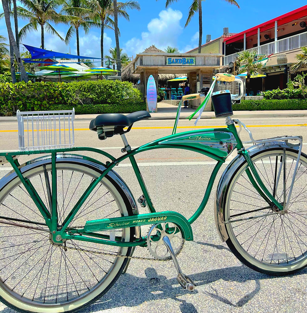 Schwinn Mark II Jaguar The Schwinn Mark II Jaguar is a true vintage standout—built for comfort, charm, and classic cruising. Finished in its original deep green paint and accented with gleaming chrome handlebars, fenders, and rims, this step-over cruiser captures that timeless Schwinn look. A functional tank and working horn add mid-century character, while front and rear racks (with a rear basket) bring everyday practicality. With durable 26″ whitewall tires, a cushioned saddle, and relaxed single-speed cruising, this Jaguar is perfect for effortless rides through Delray Beach in retro style. Designed for riders between 5′2″ and 6′2″ tall. 26″ wheels provide a smooth, balanced ride for relaxed coastal cruising. **Features** • Original green finish with classic step-over frame • Functional tank and working horn for vintage authenticity • Chrome handlebars, fenders, and rims for polished appeal • Front and rear racks with rear basket for added convenience • Durable 26″ whitewall tires for smooth rolling and stability • Cushioned saddle seat and ergonomic handlebars for comfort • Single-speed drivetrain for simple, low-maintenance cruising • Reliable coaster-brake for easy stopping • Fits most adult riders (5′2″–6′2″) **Extras Included** • Compact Rear Basket – Ideal for light essentials or small beach bag • Front rack for additional carrying space • Cup holder for your favorite drink • Bell for friendly alerts • Lock for peace of mind • Handlebar tassels for vintage flair • Helmets available upon request • Bluetooth speaker available for a small fee **Free Delivery & Pick-Up** Enjoy free delivery and pick-up anywhere within our designated Delray Beach zones. Choose your spot, and we’ll meet you there with your cruiser—ready to ride.