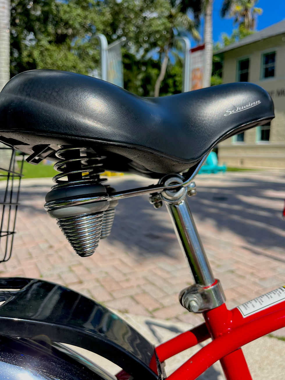 Schwinn Tank Cruiser The Schwinn Tank Cruiser delivers classic American design with a bold red and white finish that turns heads from the boardwalk to downtown Delray. Featuring a vintage-style tank, springer front fork, and spring saddle seat, this cruiser blends retro appeal with laid-back comfort. The sturdy blackwall tires and single-speed drivetrain make it perfect for easy, smooth rides wherever the day takes you. Designed for riders between 5′2″ and 6′2″ tall. 26″ wheels provide a steady, balanced ride for relaxed cruising. **Features** • Striking red and white finish with vintage step-over frame • Vintage-style tank (non-functional) for classic Schwinn character • Springer front fork for a smooth, nostalgic ride • Spring saddle seat for added comfort • Durable blackwall tires built for stability and style • Single-speed drivetrain for effortless cruising • Reliable coaster-brake for simple stopping • Fits most adult riders (5′2″–6′2″) **Extras Included** • Compact Rear Basket – Ideal for light essentials or small beach bag • Cup holder for your favorite drink • Bell for friendly alerts • Lock for peace of mind • Handlebar tassels for vintage flair • Helmets available upon request • Bluetooth speaker available for a small fee **Free Delivery & Pick-Up** Enjoy free delivery and pick-up anywhere within our designated Delray Beach zones. Choose your spot, and we’ll meet you there with your cruiser—ready to ride.