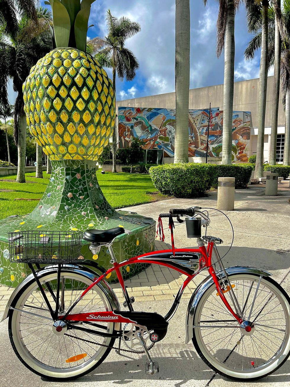 Schwinn Breeze The Schwinn Breeze is a vintage touring favorite built for smooth, relaxed rides through town or along the coast. Finished in its original red paint—beautifully preserved and full of character—this 3-speed step-through cruiser offers easy pedaling and classic handling. Slim tires and handbrakes provide a smooth, confident ride, while chrome handlebars, fenders, and rims add signature Schwinn shine. A front basket and cheerful ladybug bell give this bike a touch of playful personality, making it perfect for leisurely cruising under the Delray sun. Designed for riders between 5′2″ and 6′0″ tall. 26″ wheels and a 3-speed hub deliver smooth, balanced performance for relaxed coastal riding. **Features** • Original red finish in excellent condition • 3-speed hub with front and rear handbrakes for smooth control • Step-through touring-style frame with slim tires for easy rolling • Chrome handlebars, fenders, and rims for timeless shine • Comfortable saddle and upright handlebars for relaxed cruising • Fits most adult riders (5′2″–6′0″) **Extras Included** • Front Basket – Spacious enough for light shopping, a tote, or beach essentials • Ladybug bell for a cheerful vintage touch • Cup holder for your favorite drink • Lock for peace of mind • Handlebar tassels for vintage flair • Helmets available upon request • Bluetooth speaker available for a small fee **Free Delivery & Pick-Up** Enjoy free delivery and pick-up anywhere within our designated Delray Beach zones. Choose your spot, and we’ll meet you there with your cruiser—ready to ride.