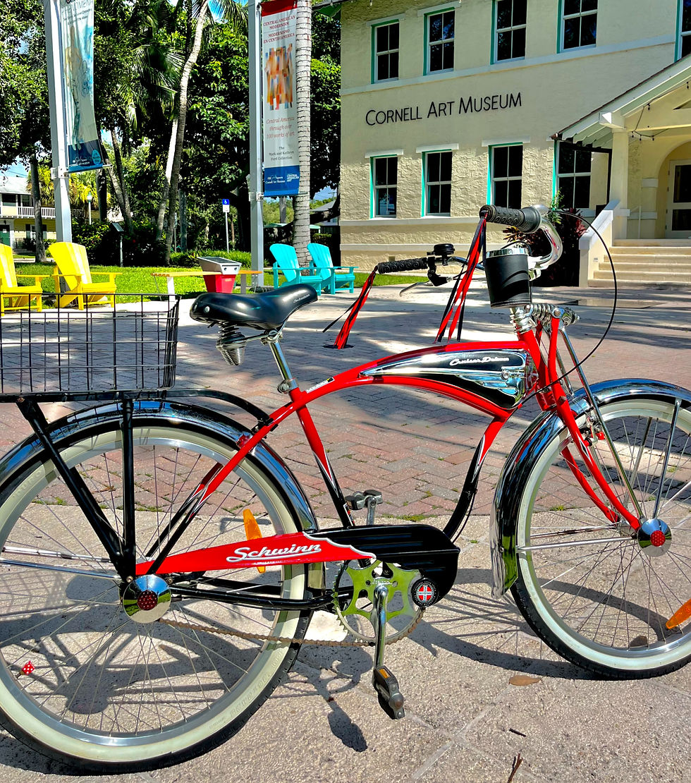 Schwinn Cruiser Deluxe The Schwinn Cruiser Deluxe is a bold classic built for riders who appreciate vintage style and effortless comfort. Finished in a striking red and black colorway with a fully functional tank and working horn, this step-over cruiser blends timeless Schwinn design with modern versatility. Chrome handlebars, fenders, and rims add a polished touch that gleams in the Delray Beach sun, while the cushioned seat and ergonomic handlebars keep every ride relaxed and comfortable. Whether you’re cruising the coast or rolling through downtown, this bike makes every ride a statement. Designed for riders between 5′2″ and 6′2″ tall. 26″ wheels provide a smooth, balanced ride for laid-back coastal cruising. **Features** • Red and black finish with classic step-over frame • Functional tank and working horn for vintage flair • Chrome handlebars, fenders, and rims for added shine • Durable 26″ whitewall tires for smooth, stable riding • Cushioned saddle seat and ergonomic handlebars for comfort • Multi-speed drivetrain for flexible, easy cruising • Coaster and front handbrake for added control • Fits most adult riders (5′2″–6′2″) **Extras Included** • Compact Rear Basket – Ideal for light essentials or small beach bag • Cup holder for your favorite drink • Bell for friendly alerts • Lock for peace of mind • Handlebar tassels for vintage flair • Helmets available upon request • Bluetooth speaker available for a small fee **Free Delivery & Pick-Up** Enjoy free delivery and pick-up anywhere within our designated Delray Beach zones. Choose your spot, and we’ll meet you there with your cruiser—ready to ride.