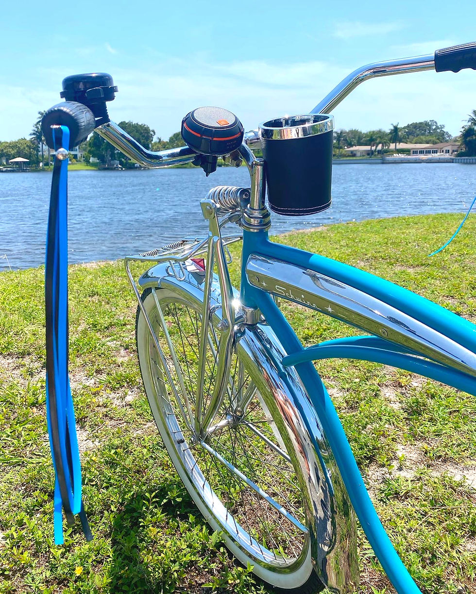 Schwinn Panther The Schwinn Panther is a gleaming icon of mid-century design—bold, bright, and built to cruise in style. Finished in a vibrant teal blue and decked out with chrome details, this step-over cruiser captures the unmistakable shine of a true Schwinn classic. A functional chrome tank and horn, chrome springer fork, handlebars, fenders, and rims make this bike sparkle under the Delray sun. With durable 26″ whitewall tires, front and rear racks, and a rear basket, the Panther blends show-stopping style with everyday practicality—perfect for beach rides, coastal cruising, or downtown adventures. Designed for riders between 5′2″ and 6′2″ tall. 26″ wheels provide a smooth, balanced ride for relaxed coastal exploring. **Features** • Vibrant teal blue finish with chrome accents throughout • Functional chrome tank and working horn for authentic Schwinn flair • Chrome springer fork for smooth, comfortable rides • Chrome handlebars, fenders, and rims for a polished look • Front and rear racks with rear basket for extra carrying space • Durable 26″ whitewall tires for smooth rolling and classic appeal • Single-speed drivetrain for easy, low-maintenance cruising • Reliable coaster-brake for simple stopping • Fits most adult riders (5′2″–6′2″) **Extras Included** • Compact Rear Basket – Ideal for light essentials or small beach bag • Front rack for additional carrying space • Cup holder for your favorite drink • Bell for friendly alerts • Lock for peace of mind • Handlebar tassels for vintage flair • Helmets available upon request • Bluetooth speaker available for a small fee **Free Delivery & Pick-Up** Enjoy free delivery and pick-up anywhere within our designated Delray Beach zones. Choose your spot, and we’ll meet you there with your cruiser—ready to ride.