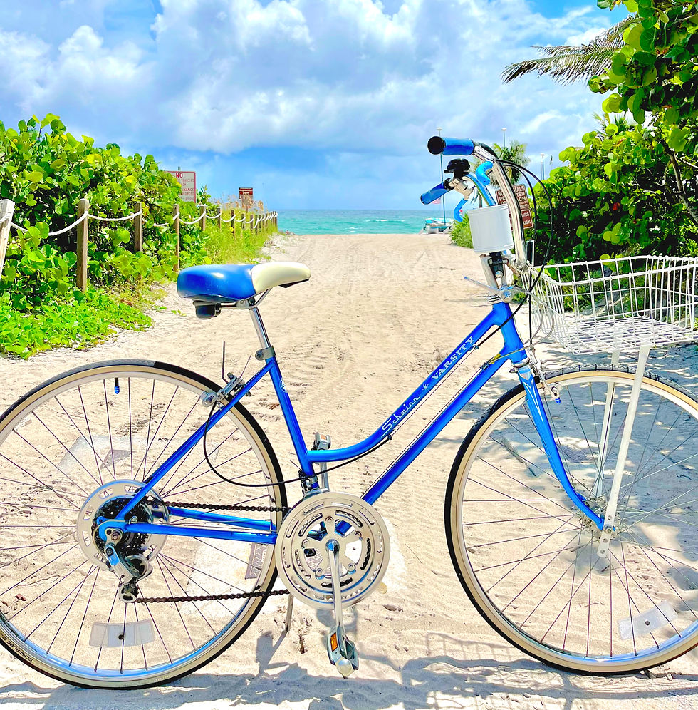Schwinn Collegiate The Schwinn Collegiate is a vintage favorite that combines timeless design with everyday comfort and practicality. Finished in its original deep blue paint and accented with chrome handlebars, fenders, and rims, this step-through cruiser captures that unmistakable Schwinn elegance. Slim tires and a multi-speed drivetrain make it ideal for relaxed yet efficient pedaling, whether you’re coasting along the beach or gliding through downtown Delray. With a front basket for light storage, it’s the perfect companion for market runs, coffee stops, or sun-soaked cruising along the coast. Designed for riders between 5′2″ and 6′0″ tall. 26″ wheels offer a balanced, smooth ride ideal for everyday exploring. **Features** • Original deep blue finish with classic step-through frame • Multi-speed drivetrain for smooth, versatile riding • Slim-profile tires for efficient road cruising • Chrome handlebars, fenders, and rims for polished vintage appeal • Front and rear handbrakes for confident stopping power • Front basket for convenient storage • Comfortable cushioned saddle and upright handlebars • Fits most adult riders (5′2″–6′0″) **Extras Included** • Front Basket – Spacious enough for light shopping, a tote, or beach essentials • Cup holder for your favorite drink • Bell for friendly alerts • Lock for peace of mind • Handlebar tassels for vintage flair • Helmets available upon request • Bluetooth speaker available for a small fee **Free Delivery & Pick-Up** Enjoy free delivery and pick-up anywhere within our designated Delray Beach zones. Choose your spot, and we’ll meet you there with your cruiser—ready to ride.
