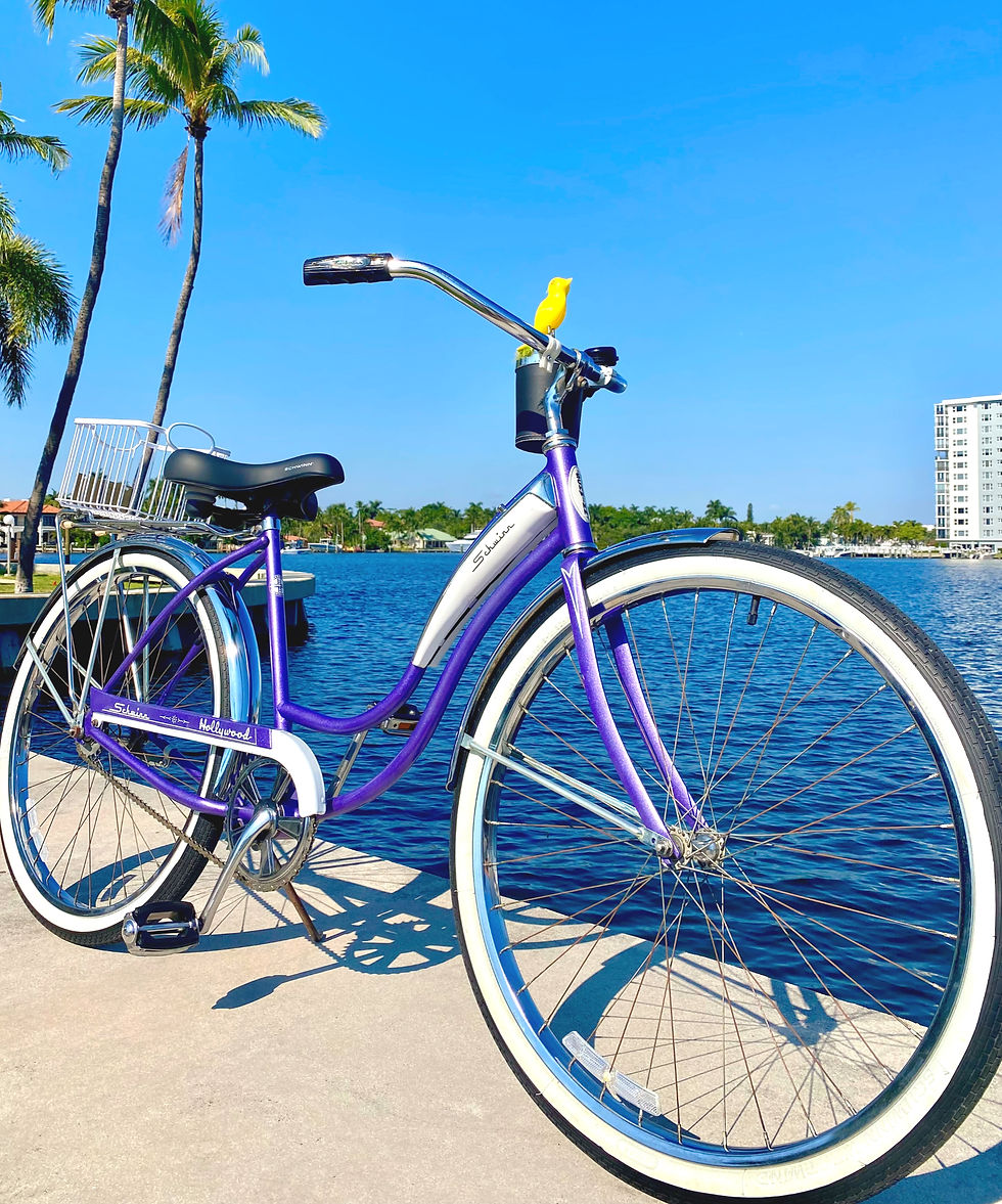 Schwinn Hollywood The Schwinn Hollywood is a vibrant step-through cruiser that blends vintage flair with easy, laid-back comfort. Finished in a bold purple with crisp white accents, it stands out with a functional tank and working horn, plus gleaming chrome rims, fenders, and handlebars that catch the Delray Beach sun. Designed for smooth, comfortable rides and undeniable curb appeal, this classic cruiser is perfect for beachside adventures and relaxed downtown explorations alike. Designed for riders between 5′2″ and 6′0″ tall. 26″ wheels provide a smooth, balanced ride for effortless coastal cruising. **Features** • Purple frame with white tank and vintage detailing • Functional tank and working horn for classic Schwinn charm • Chrome rims, fenders, and handlebars for timeless shine • Durable 26″ whitewall tires for smooth rolling • Cushioned saddle seat and ergonomic handlebars for comfort • Reliable coaster-brake for easy stopping • Fits most adult riders (5′2″–6′0″) **Extras Included** • Compact Rear Basket – Ideal for light essentials or small beach bag • Cup holder for your favorite drink • Bell for friendly alerts • Lock for peace of mind • Handlebar tassels for vintage flair • Helmets available upon request • Bluetooth speaker available for a small fee **Free Delivery & Pick-Up** Enjoy free delivery and pick-up anywhere within our designated Delray Beach zones. Choose your spot, and we’ll meet you there with your cruiser—ready to ride.