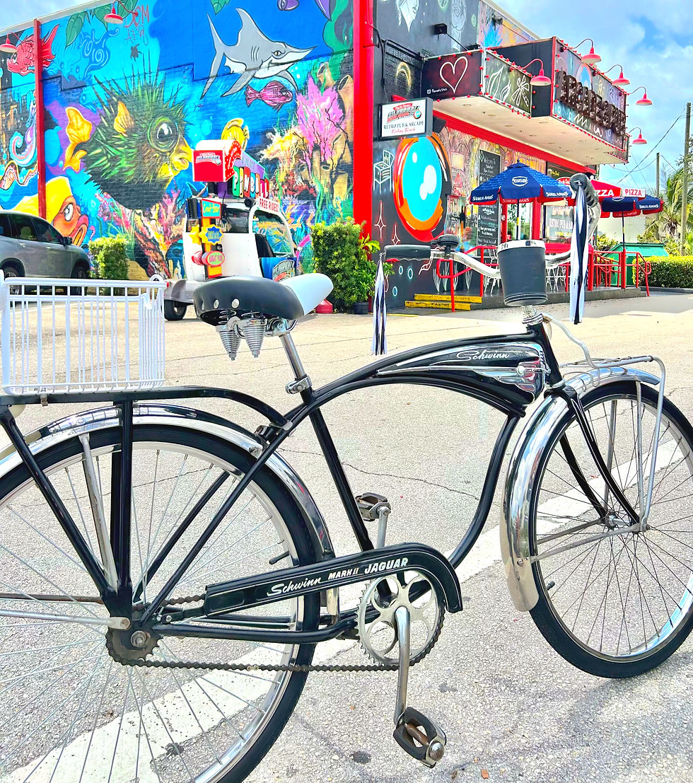 Schwinn Mark II Jaguar The Schwinn Mark II Jaguar is a striking original that combines classic black-and-white styling with the comfort and reliability of a true vintage cruiser. Finished in its original black paint with crisp white accents, this step-over model features chrome handlebars, fenders, and rims that shine in the Florida sun. A functional tank and working horn add authentic mid-century charm, while front and rear racks—complete with a rear basket—make it as practical as it is stylish. With sturdy blackwall tires, a coaster brake, and single-speed simplicity, the Jaguar is perfect for relaxed, easygoing rides through Delray Beach. Designed for riders between 5′2″ and 6′2″ tall. 26″ wheels provide a stable, balanced ride for smooth coastal cruising. **Features** • Original black paint with white accents and classic step-over frame • Functional tank and working horn for vintage Schwinn character • Chrome handlebars, fenders, and rims for polished appeal • 26″ blackwall tires for smooth rolling and bold styling • Single-speed drivetrain for simple, low-maintenance riding • Reliable coaster-brake for easy stopping • Front and rear racks with rear basket for added convenience • Fits most adult riders (5′2″–6′2″) **Extras Included** • Compact Rear Basket – Ideal for light essentials or small beach bag • Front rack for extra carrying space • Cup holder for your favorite drink • Bell for friendly alerts • Lock for peace of mind • Handlebar tassels for vintage flair • Helmets available upon request • Bluetooth speaker available for a small fee **Free Delivery & Pick-Up** Enjoy free delivery and pick-up anywhere within our designated Delray Beach zones. Choose your spot, and we’ll meet you there with your cruiser—ready to ride.